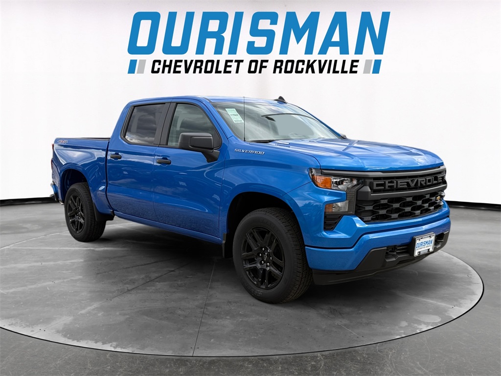 This NEW 2025 Riptide Blue Metallic Chevrolet Silverado 1500 Custom 4WD is well equipped and includes these features and benefits:Custom Convenience Package (Electric Rear-Window Defogger, EZ Lift Power Lock & Release Tailgate, LED Cargo Area Lighting, Remote Vehicle Starter System, and Theft Deterrent System (Unauthorized Entry)), Custom Value Package, High Capacity Suspension Package, Preferred Equipment Group 1CX (10-Way Power Driver Seat w/Lumbar, 120-Volt Bed Mounted Power Outlet, 120-Volt Interior Power Outlet, 3.5" Monochromatic Display Driver Info Center, Bluetooth® For Phone, Color-Keyed Carpeting Floor Covering, Deep-Tinted Glass, Dual Rear USB Ports (Charge Only), Electronic Cruise Control, Front Frame-Mounted Black Recovery Hooks, Front Rubberized Vinyl Floor Mats, HD Rear Vision Camera, Manual Tilt Wheel Steering Column, OnStar Services Capable, Power Front Windows w/Driver Express Up/Down, Power Front Windows w/Passenger Express Down, Power Rear Windows w/Express Down, Rear 60/40 Folding Bench Seat (Folds Up), Rear Rubberized-Vinyl Floor Mats, Remote Keyless Entry, SiriusXM Trial Subscription, Standard Tailgate, Teen Driver, Tire Pressure Monitoring System, and Wi-Fi Hot Spot Capable), Trailering Package (Hitch Guidance), 8-Speed Automatic, 4WD, Jet Black w/Cloth Seat Trim, 3.42 Rear Axle Ratio, 4-Wheel Disc Brakes, 40/20/40 Front Split-Bench Seat, 6 Speakers, 6-Speaker Audio System, ABS brakes, Air Conditioning, Alloy wheels, AM/FM radio: SiriusXM, Apple CarPlay/Android Auto, Auto High-beam Headlights, Automatic Emergency Braking, Brake assist, Bumpers: body-color, Cloth Seat Trim, Compass, Delay-off headlights, Driver door bin, Driver vanity mirror, Dual front impact airbags, Dual front side impact airbags, Electronic Stability Control, Emergency communication system: OnStar, Following Distance Indicator, Forward Collision Alert, Front anti-roll bar, Front Center Armrest w/Storage, Front License Plate Kit, Front Pedestrian Braking, Front reading lights, Front wheel independent suspension, Fully automatic headlights, Heated door mirrors, Illuminated entry, Integrated Trailer Brake Controller, IntelliBeam Automatic High Beam On/Off, Lane Keep Assist w/Lane Departure Warning, Low tire pressure warning, Occupant sensing airbag, Outside temperature display, Overhead airbag, Overhead console, Panic alarm, Passenger door bin, Passenger vanity mirror, Power door mirrors, Power driver seat, Power steering, Power windows, Premium audio system: Chevrolet Infotainment 3, Radio data system, Radio: Chevrolet Infotainment 3 System, Rear reading lights, Rear step bumper, Rear window defroster, Remote keyless entry, Security system, Speed control, Speed-sensing steering, Split folding rear seat, Tachometer, Tilt steering wheel, Traction control, Trip computer, Variably intermittent wipers, Voltmeter, Wheels: 20" x 9" Bright Silver Painted Aluminum, and Wheels: 20" x 9" High Gloss Black Painted Alum. 8-Speed Automatic, 4WD, Jet Black w/Cloth Seat Trim. 8-Speed Automatic 2.7L I4 Turbocharged DOHC 16V LEV3-SULEV30 310hpNew Vehicle Prices do not include tax, tags, title, freight/destination, registration, electronic filing fee, processing fee of $800 (Not required by law), and iKon (Optional $1,295.) Call Sales Managers for any additional questions at 301-424-5900. See dealer for rebate eligibility. Price includes rebates applicable to qualifying customers.$1000 - Bonus Cash. Exp. 11/03/2025 $3000 - Customer Cash. Exp. 11/03/2025