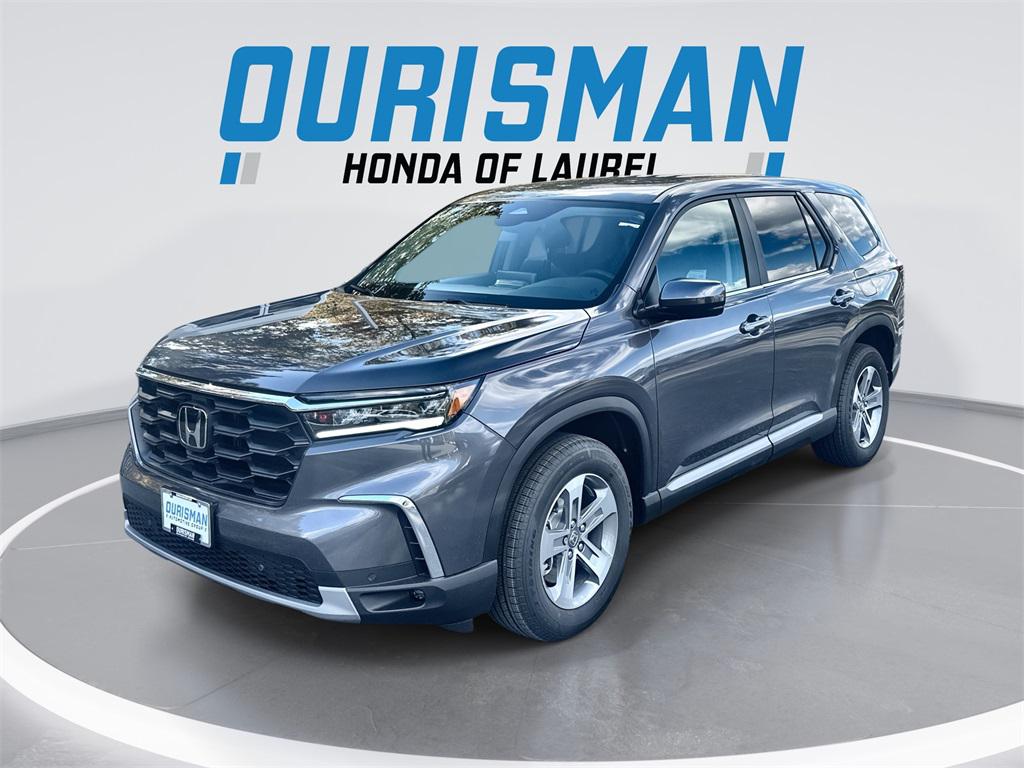 Ourisman Honda of Laurel welcomes you to come test drive this NEW 2025 Modern Steel Metallic Honda Pilot EX-L AWD is well equipped and includes these features and benefits:AWD, 3rd row seats: split-bench, 4-Wheel Disc Brakes, 4.167 Axle Ratio, 9 Speakers, ABS brakes, Adaptive Cruise Control: Adaptive Cruise Control (ACC) with Low-Speed Follow, Air Conditioning, Alloy wheels, AM/FM radio: SiriusXM, Apple CarPlay/Android Auto, Auto High-beam Headlights, Auto-dimming Rear-View mirror, Automatic temperature control, Blind Spot Information (BSI) System warning, Brake assist, Bumpers: body-color, Delay-off headlights, Driver door bin, Driver vanity mirror, Dual front impact airbags, Dual front side impact airbags, Electronic Stability Control, Emergency communication system: HondaLink Assist, Exterior Parking Camera Rear, Four wheel independent suspension, Front anti-roll bar, Front Bucket Seats, Front Center Armrest, Front dual zone A/C, Front fog lights, Front reading lights, Fully automatic headlights, Garage door transmitter: HomeLink, Heated door mirrors, Heated Front Bucket Seats, Heated front seats, Illuminated entry, Knee airbag, Lane departure: Lane Keeping Assist System (LKAS) active, Leather Seat Trim, Low tire pressure warning, Memory seat, Occupant sensing airbag, Outside temperature display, Overhead airbag, Overhead console, Panic alarm, Passenger door bin, Passenger vanity mirror, Power door mirrors, Power driver seat, Power Liftgate, Power passenger seat, Power steering, Power windows, Radio data system, Radio: 245-Watt Audio System, Rear air conditioning, Rear anti-roll bar, Rear reading lights, Rear seat center armrest, Rear window defroster, Rear window wiper, Reclining 3rd row seat, Remote keyless entry, Security system, SiriusXM, Speed control, Speed-sensing steering, Speed-Sensitive Wipers, Split folding rear seat, Spoiler, Steering wheel mounted audio controls, Tachometer, Telescoping steering wheel, Tilt steering wheel, Traction control, Trip computer, Turn signal indicator mirrors, Variably intermittent wipers, and Wheels: 18"" Pewter Gray Machined Face. AWD.Prices do not include tax, tags, title, registration, electronic filing fee, processing fee of $800.
