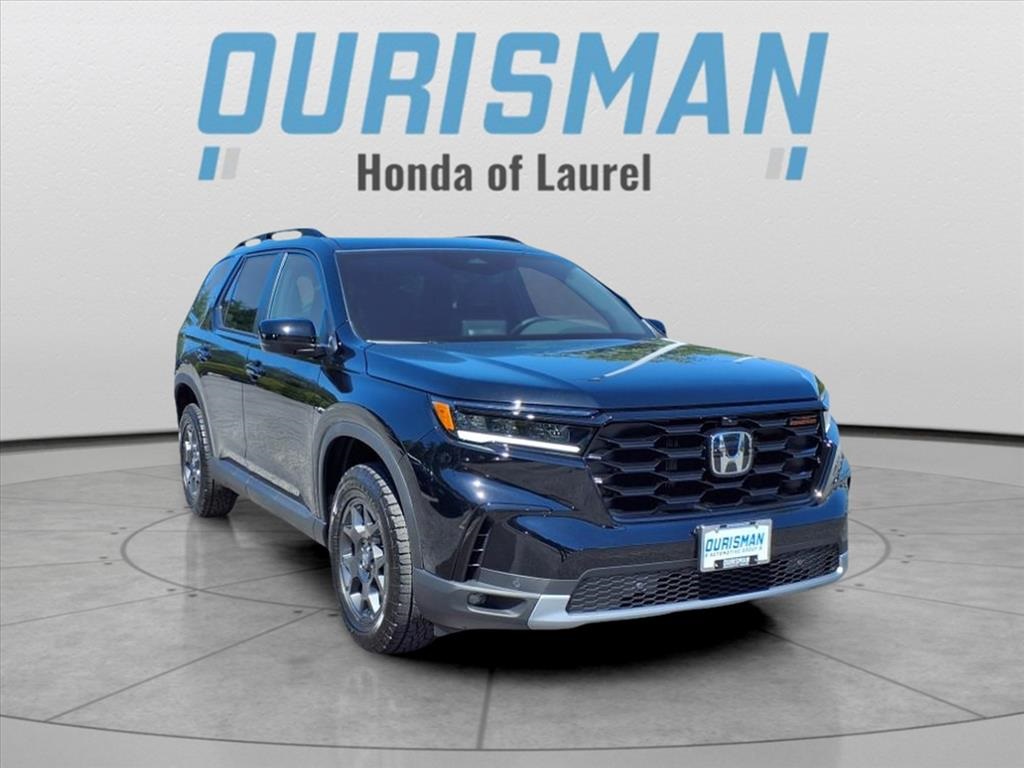 Ourisman Honda of Laurel welcomes you to come test drive this NEW 2025 Crystal Black Pearl Honda Pilot TrailSport AWD is well equipped and includes these features and benefits:AWD, 3rd row seats: split-bench, 4-Wheel Disc Brakes, 4.167 Axle Ratio, 9 Speakers, ABS brakes, Adaptive Cruise Control: Adaptive Cruise Control (ACC) with Low-Speed Follow, Air Conditioning, Alloy wheels, AM/FM radio: SiriusXM, Apple CarPlay/Android Auto, Auto High-beam Headlights, Auto-dimming Rear-View mirror, Automatic temperature control, Blind Spot Information (BSI) System warning, Brake assist, Bumpers: body-color, Delay-off headlights, Driver door bin, Driver vanity mirror, Dual front impact airbags, Dual front side impact airbags, Durable Synthetic Leather Seat Trim, Electronic Stability Control, Emergency communication system: HondaLink Assist, Exterior Parking Camera Rear, Four wheel independent suspension, Front anti-roll bar, Front Bucket Seats, Front Center Armrest, Front dual zone A/C, Front fog lights, Front reading lights, Fully automatic headlights, Garage door transmitter: HomeLink, Heated door mirrors, Heated Front Bucket Seats, Heated front seats, Illuminated entry, Knee airbag, Lane departure: Lane Keeping Assist System (LKAS) active, Low tire pressure warning, Memory seat, Occupant sensing airbag, Outside temperature display, Overhead airbag, Overhead console, Panic alarm, Passenger door bin, Passenger vanity mirror, Power door mirrors, Power driver seat, Power Liftgate, Power moonroof, Power passenger seat, Power steering, Power windows, Radio data system, Radio: 245-Watt Audio System, Rear air conditioning, Rear anti-roll bar, Rear reading lights, Rear window defroster, Rear window wiper, Reclining 3rd row seat, Remote keyless entry, Security system, SiriusXM, Speed control, Speed-sensing steering, Speed-Sensitive Wipers, Split folding rear seat, Spoiler, Steering wheel mounted audio controls, Tachometer, Telescoping steering wheel, Tilt steering wheel, Traction control, Trip computer, Turn signal indicator mirrors, Variably intermittent wipers, and Wheels: 18"" Shark Gray w/Black Lug Nuts. AWD.Prices do not include tax, tags, title, registration, electronic filing fee, processing fee of $800 (Not required by law), iKon (Optional $1,295.), And any reconditioning fees.